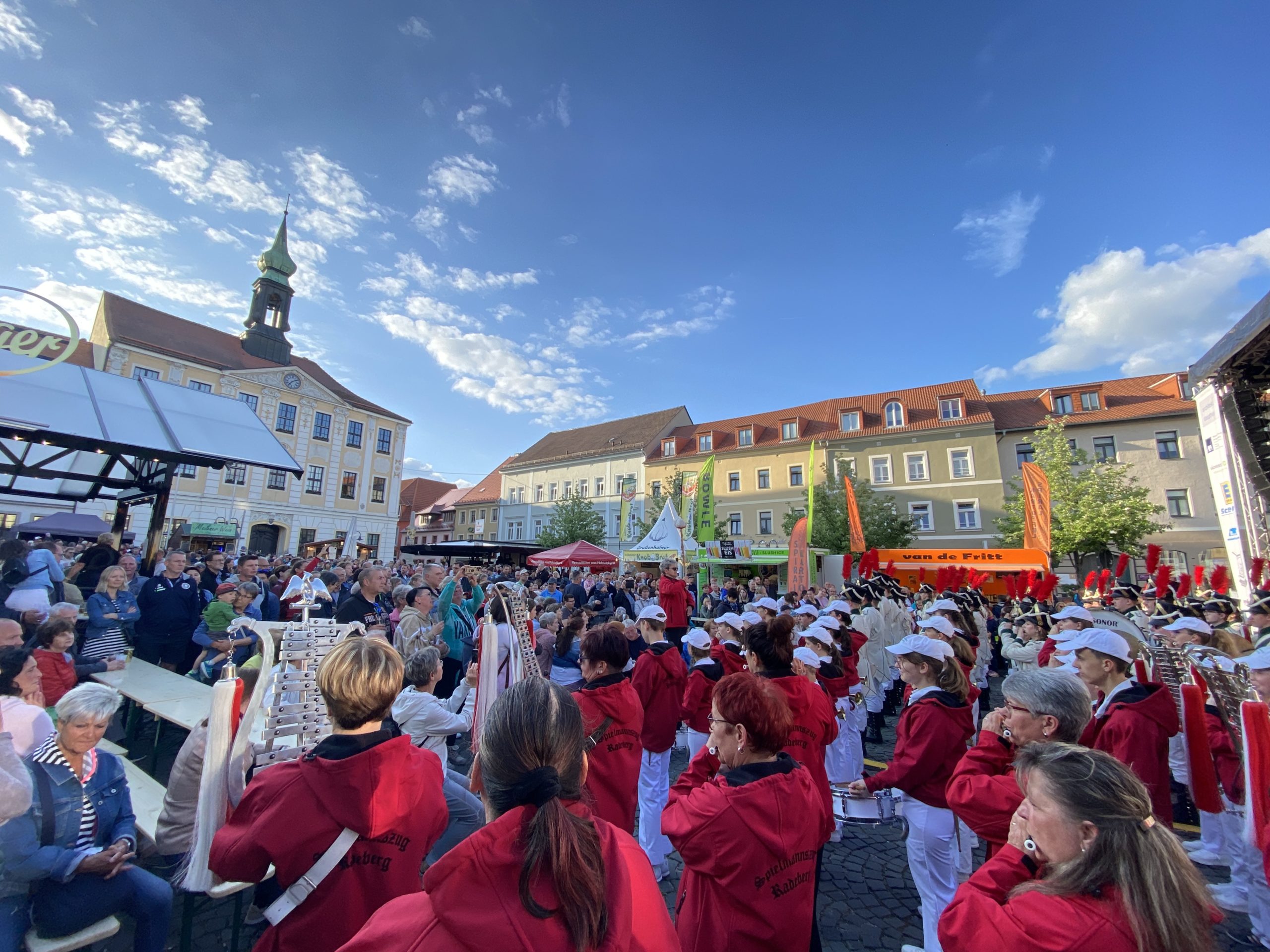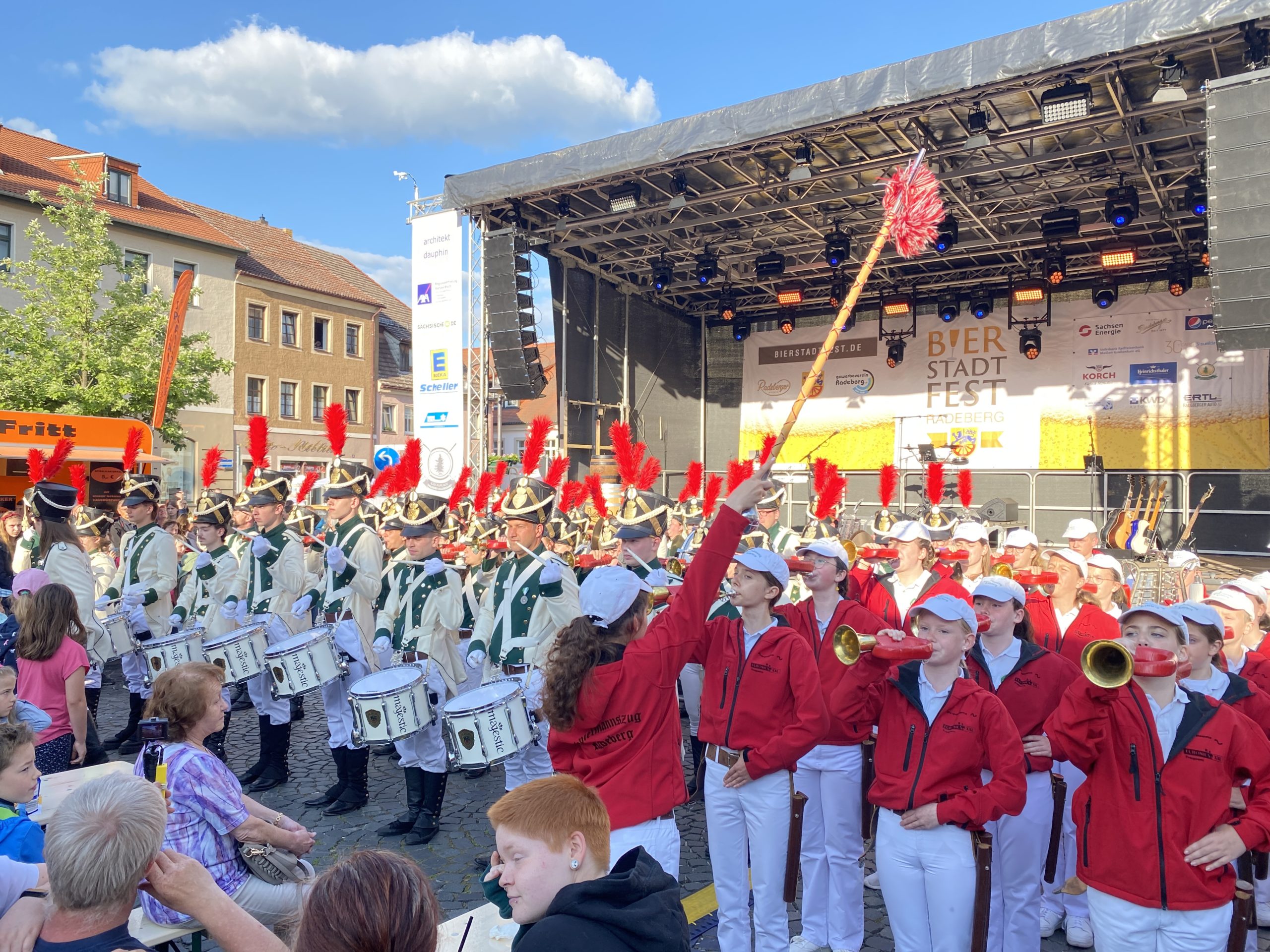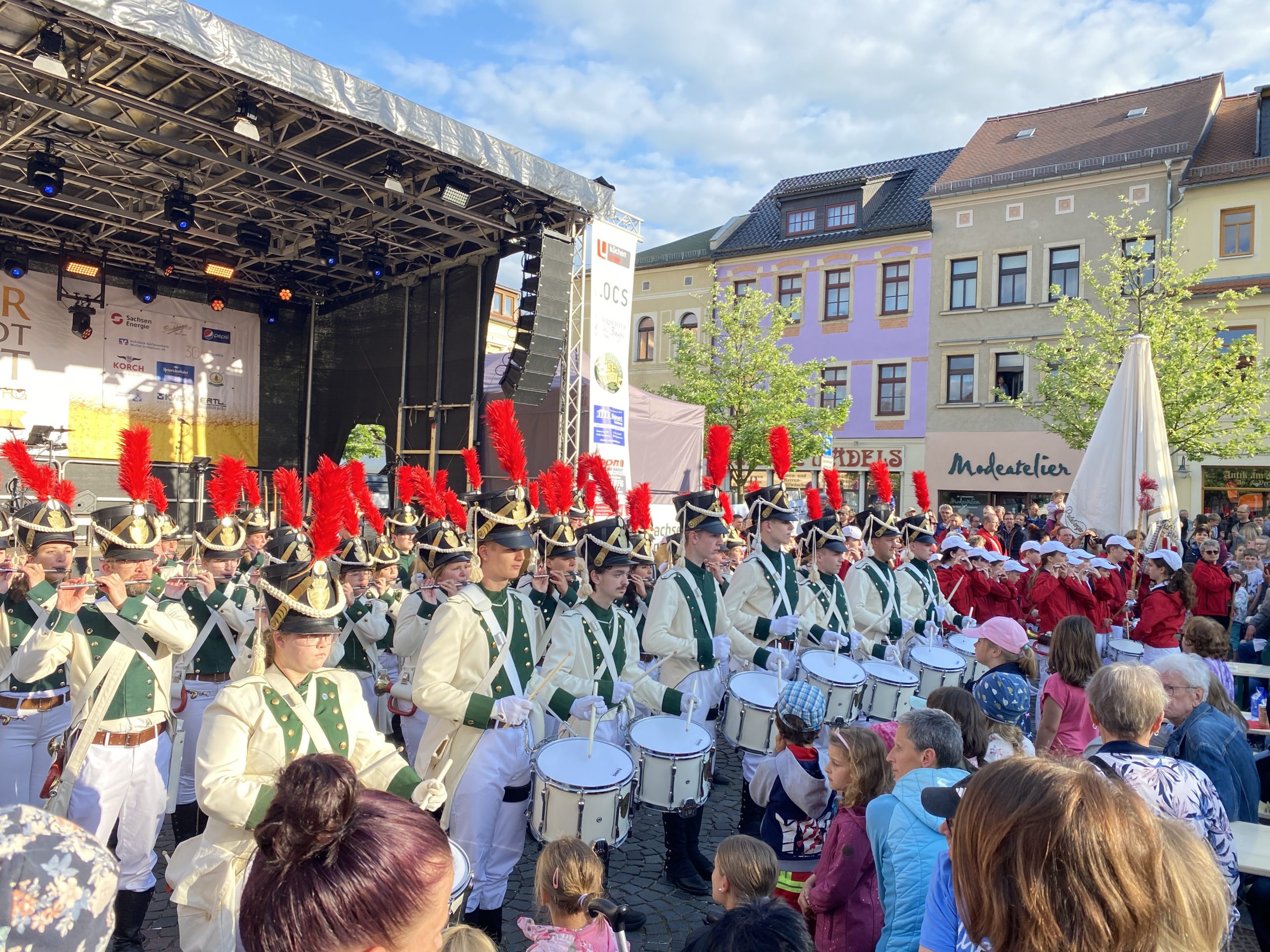 Es ist wieder so weit: Radeberg lädt zum Bierstadtfest. Zur Tradition gehört auch die musikalische Eröffnung am Freitagabend durch den Spielmannszug Radeberg. Drei Formationen nahmen dafür mit einem Sternmarsch, also mehreren Umzügen aus verschiedenen Richtungen zur Hauptbühne, auf dem Marktplatz Aufstellung. Noch bis Sonntagabend findet das Bierstadtfest vor allem auf der Hauptstraße und rund um dem Marktplatz statt.